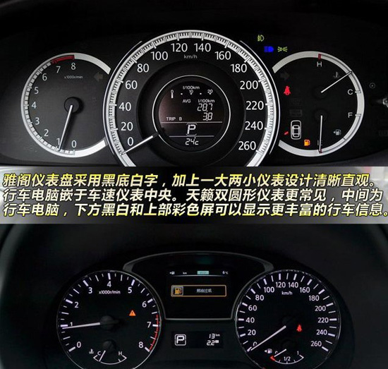 儀表方面,雅閣的儀表盤(pán)采用黑底白字,加上一大兩小的儀表設(shè)計(jì)清晰直觀。行車(chē)電腦嵌于車(chē)速儀表中央,涵蓋了行駛里程、瞬時(shí)油耗等信息。更多的行車(chē)信息就交給中控臺(tái)上方的彩色屏幕顯示。天籟雙圓形儀表更加常見(jiàn),中間為行車(chē)電腦區(qū)域,下方黑白屏顯示擋位和油耗等最常用的信息,彩色則可以顯示更豐富的行車(chē)信息。從儀表觀感和設(shè)計(jì)來(lái)看,天籟要比雅閣更為符合多數(shù)人的用車(chē)習(xí)慣,效果也更為出眾。
