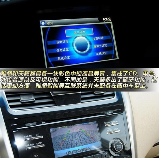 中控方面,雅閣和天籟都具備一塊彩色中控液晶屏幕,集成了CD、電臺(tái)、外接音源以及可視功能。不同的是,天籟多出了藍(lán)牙功能,通話(huà)更加方便。盡管雅閣有智能屏互聯(lián)系統(tǒng),可以實(shí)現(xiàn)手機(jī)鏡像,但在2.0L EX豪華車(chē)型上并沒(méi)有配備這塊彩色液晶屏,只是提供了一個(gè)多功能顯示屏。