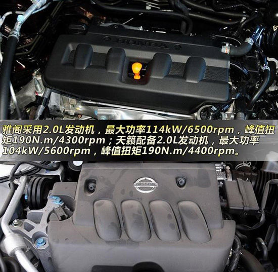 天籟采用了一臺(tái)代號(hào)MR20DE的2.0L發(fā)動(dòng)機(jī),具備C-VTC連續(xù)可變氣門正時(shí)功能,最大功率104kW/5600rpm,峰值扭矩190N.m/4400rpm,扭矩與雅閣一致,功率稍低,但是最大功率轉(zhuǎn)速卻比雅閣提前了900轉(zhuǎn),這臺(tái)發(fā)動(dòng)機(jī)優(yōu)勢(shì)工作狀態(tài)比較平穩(wěn)安靜,同時(shí)工信部油耗為7.3升,比雅閣稍低。這臺(tái)發(fā)動(dòng)機(jī)也不挑食,93號(hào)(京92)號(hào)汽油完全足夠。
