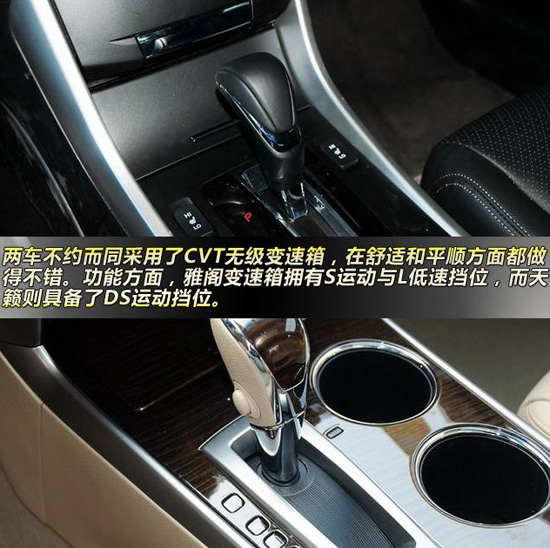 變速箱方面,兩車不約而同采用了CVT無級(jí)變速箱,在舒適和平順方面都做得不錯(cuò)。功能方面,雅閣變速箱擁有S運(yùn)動(dòng)與L低速擋位,而天籟則具備了DS運(yùn)動(dòng)擋位。