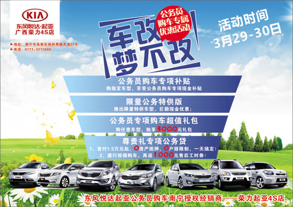 (廣西汽車網(wǎng) 訊)近日,編輯從東風悅達起亞廣西榮力4S店了解到,為了公務員買車更方便,商家將在3月29-30日期間在店頭舉辦主題為“車改 夢不改”的公務員購車專屬優(yōu)惠活動。屆時將有四重大禮等著消息者。具體優(yōu)惠如下: