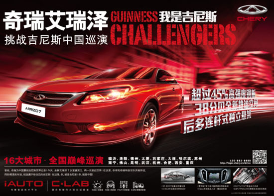 據(jù)悉,此次“我是吉尼斯——奇瑞艾瑞澤挑戰(zhàn)吉尼斯中國巡演”由奇瑞汽車傾情打造,堪稱2014年國內(nèi)最具魅力的大型巡演之一。活動自4月10日開始,分為南北兩線在國內(nèi)16座城市輪番上演。其中北線城市包括臨沂、洛陽、德州、太原、石家莊、大連、哈爾濱、蘇州共8座城市;南線城市包括南寧、佛山、昆明、武漢、杭州、合肥、西安、重慶共8座城市;顒悠陂g,現(xiàn)場觀眾不僅能體驗到獨(dú)一無二的汽車主題之夜,有機(jī)會領(lǐng)略到汽車運(yùn)動的無限魅力,同時還能欣賞到創(chuàng)造吉尼斯紀(jì)錄的經(jīng)典再現(xiàn)。