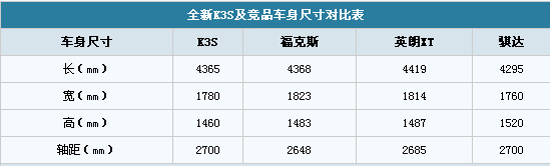 K3S的長(zhǎng)寬高分別為4365/1780/1460mm,數(shù)據(jù)方面雖不出眾但也不落人后,特別是2700mm的軸距在對(duì)手中占有一定的優(yōu)勢(shì)。因此,在車內(nèi)空間表現(xiàn)上K3S讓人非常滿意。