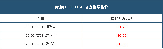 在本屆北京車展上,一汽-大眾奧迪正式宣布旗下Q3 30 TFSI車型上市,新車的售價為24.98-28.98萬元,詳細價格信息請見下表: