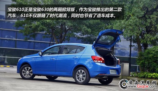 寶駿610前臉造型采用了與全新寶駿630相同的家族式設計,最主要的不同之處還是車尾的造型,610兩廂掀背式的設計顯得更緊湊,不過全新的擾流板、包覆式的后風擋玻璃和硬朗的車尾線條,以及15英寸亮面的鋁合金輪轂等均展現(xiàn)出了其動感的特質(zhì)。另外,新車的長寬高分別為4401mm/1736mm/1463mm,軸距為2640mm。