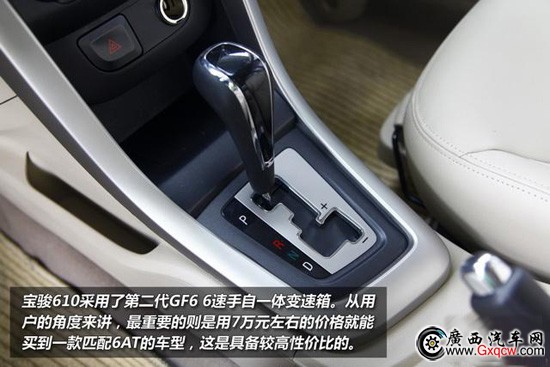 動力方面,寶駿610搭載了1.5L DVVT自然吸氣發(fā)動機,并與通用GF第二代6速手自一體式變速器相匹配。其中該發(fā)動機能提供最大81kW的最大動力輸出,以及最大145Nm的峰值扭矩。而這款自動變速器同樣也配備在別克君威、別克君越和雪佛蘭邁銳寶等車型之上。根據(jù)官方的數(shù)據(jù)顯示,自動擋車型的百公里綜合油耗僅有7.0L。