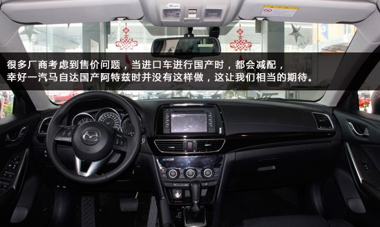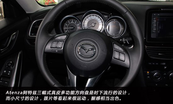 阿特茲的內(nèi)飾也與進口版保持了一致,但相對于出色的外表,內(nèi)飾的設計顯得有些平庸了。造型動感的三輻式方向盤看上去相當帶勁兒,握感很不錯。儀表盤采用了樸素的黑白配色,炮筒式的三圓形儀表營造出了強烈的運動感激發(fā)起人們的駕駛欲望。用料中規(guī)中矩,中控臺上表面以及門板扶手以上區(qū)域都采用了軟性材質(zhì),其它區(qū)域大多為硬塑料。