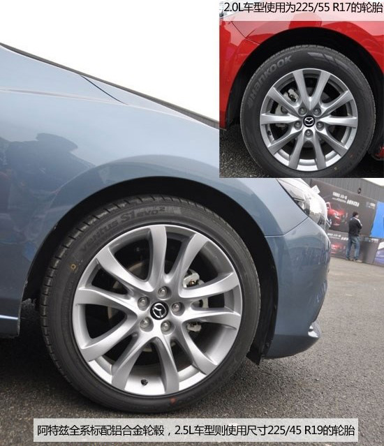 阿特茲全系標配鋁合金輪轂,2.0L車型使用尺寸為225/55R17的輪胎,2.5L車型則使用尺寸225/45R19的輪胎。