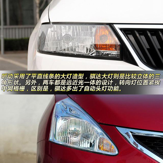 頭燈方面,昕動采用了平直線條的大燈造型,騏達大燈則是比較立體的三角形狀,兩車都是遠近光一體的設(shè)計,區(qū)別是,騏達多出了自動頭燈功能。