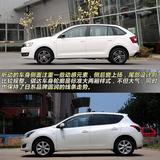 車身側(cè)面,昕動的車身側(cè)面注重一些動感元素,側(cè)后窗上揚,尾部設(shè)計則比較規(guī)整。騏達車身輪廓是標準大兩廂樣式,不但大氣,同時也保持了日系品牌圓潤的線條走勢。大致觀感結(jié)論如下,昕動車身顯得更為張揚,而騏達則大氣時尚兼顧沉穩(wěn)。