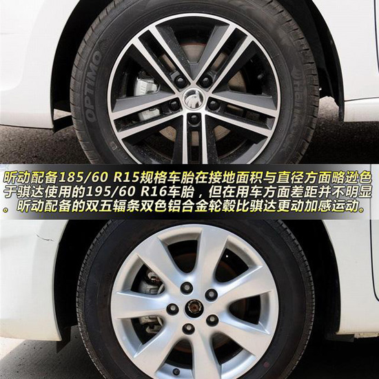 車胎方面,昕動配備185/60 R15規(guī)格車胎在接地面積與直徑方面略遜色于騏達使用的195/60 R16車胎,但在用車方面差距并不明顯。昕動配備的雙五輻條雙色鋁合金輪轂顯得動感時尚,騏達則使用了較為常見的七輻條輪轂。