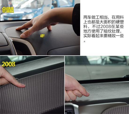 創(chuàng)酷內(nèi)飾相對普通,沒有太大的特色,當(dāng)然不少人會埋怨這種看上去沒有太大新鮮感得內(nèi)飾氛圍,好在整體布局合理,既然沒有太大花炫的色彩,自然要在實用性方便下點功夫,我想這正是創(chuàng)酷所要表達的思想。2008內(nèi)飾則是另外一番天地,富有層次且略顯科技感得中控的確給我們帶來不錯的新鮮感,并且黑色和棕色的拼接方式看起來十分舒服。