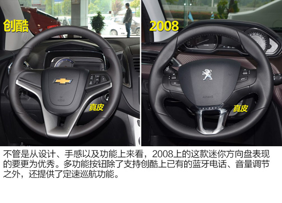 兩車方向盤都采用了真皮包裹并配備了多功能按鍵。就設(shè)計而言,相信不少人跟我一樣會喜歡右圖中這個迷你一些的方向盤。從使用的角度來看,2008上的方向盤握感要飽滿一些,不過有些人可能會感覺方向盤過于偏小了,相比來看,創(chuàng)酷上的這個方向盤尺寸就稍稍有些偏大了。