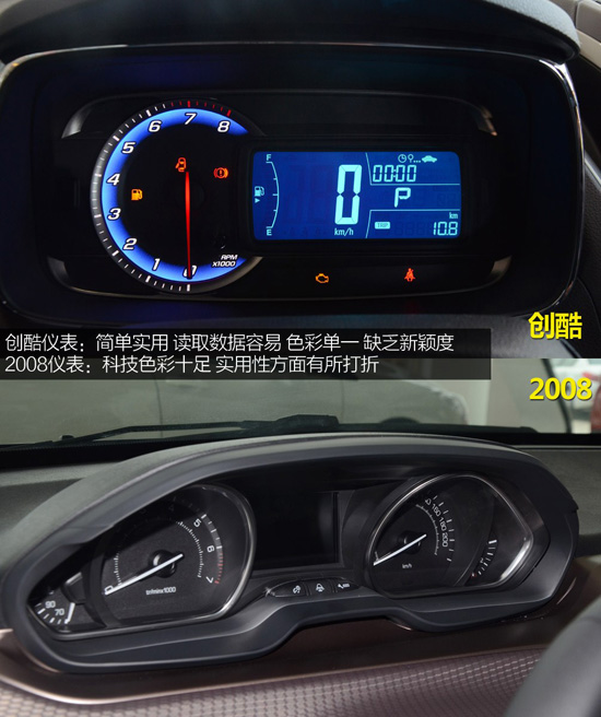 創(chuàng)酷儀表采用了類似愛唯歐的設(shè)計,左邊是傳統(tǒng)的轉(zhuǎn)速表,時速表使用了數(shù)字儀表,和一些行車信息都在右邊的一塊長方型液晶屏內(nèi)顯示,好處是讀取數(shù)據(jù)比較容易,缺點是儀表色彩單一,沒有太大的科技感。相比于創(chuàng)酷,2008儀表絕對新穎,左右兩邊分別是轉(zhuǎn)速表和時速表,中間顯示屏可顯示油耗、里程、檔位等信息,外圍的燈帶和氛圍燈將簡單的儀表點綴的相當(dāng)有科技色彩。儀表的本身設(shè)計倒沒有什么問題,倒是上方由于方向盤的遮擋,在讀數(shù)方面會有所打折。