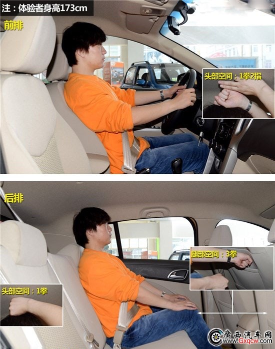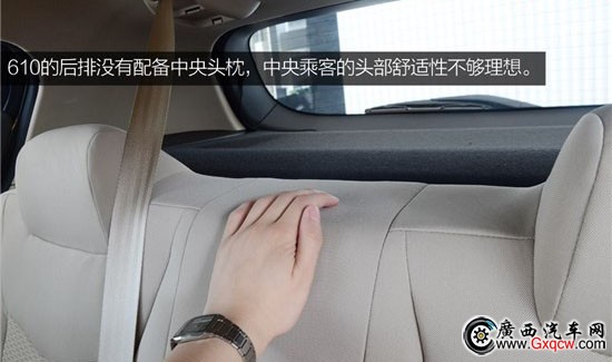 身高173公分的體驗者調(diào)整好座椅后,能獲得一拳+兩指的頭部剩余;保持前排座椅不調(diào)整的情況下,173公分的體驗者來到后排,能獲得一拳的頭部剩余和三拳的腿部剩余。整體看來,610的乘坐空間還是很寬敞的。