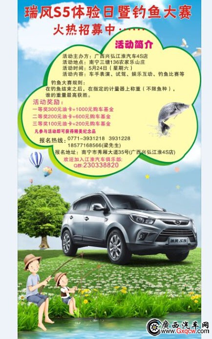 “GO!去體驗,好車試起來!”廣西興弘江淮汽車4S店瑞風S5駕•值體驗日活動將在5月24日在南寧市三塘136農(nóng)家樂山莊舉行。我們?yōu)槟鷾蕚淞霜毦呓承牡闹本試駕、科目試駕、越野試駕等環(huán)節(jié)。屆時您的駕駛技術(shù)將在專業(yè)試駕教練指導下更為精湛,體驗“飛凡”駕駛樂趣。報名電話:400-922-0771 轉(zhuǎn)8119