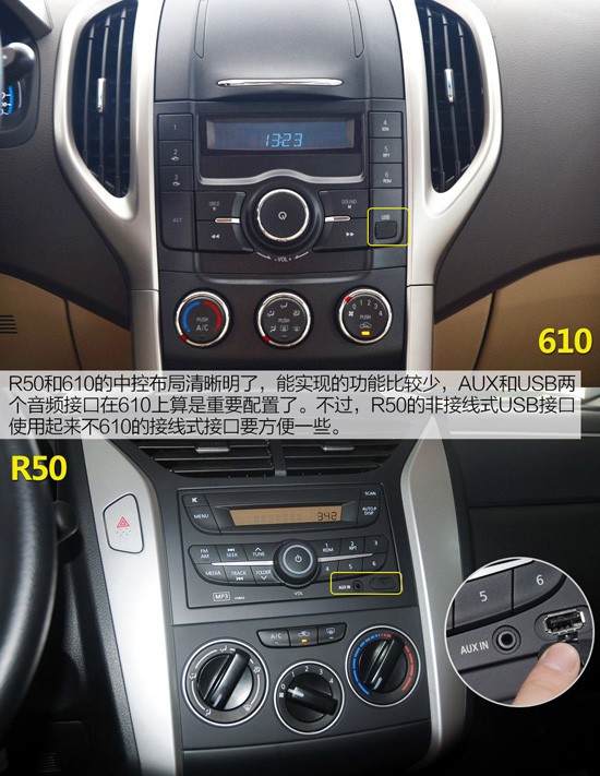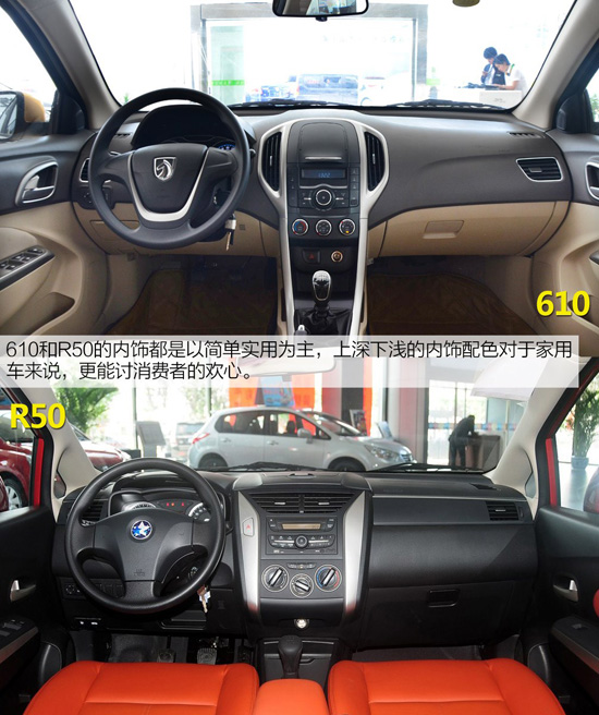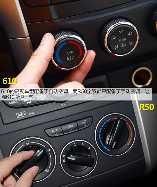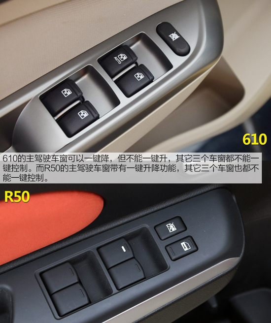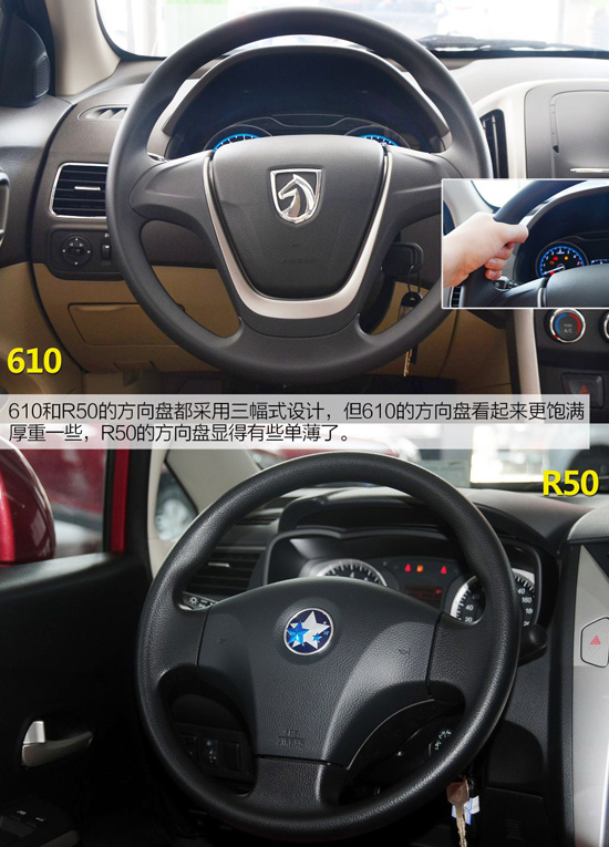 R50的方向盤全系都沒有配備皮質(zhì)包裹和多功能按鍵,而610高配車型都配備了,除此之外,R50的方向盤一點(diǎn)裝飾都沒有,看起來很突兀,610的方向盤擁有鍍鉻裝飾,看起來要舒服一些。
