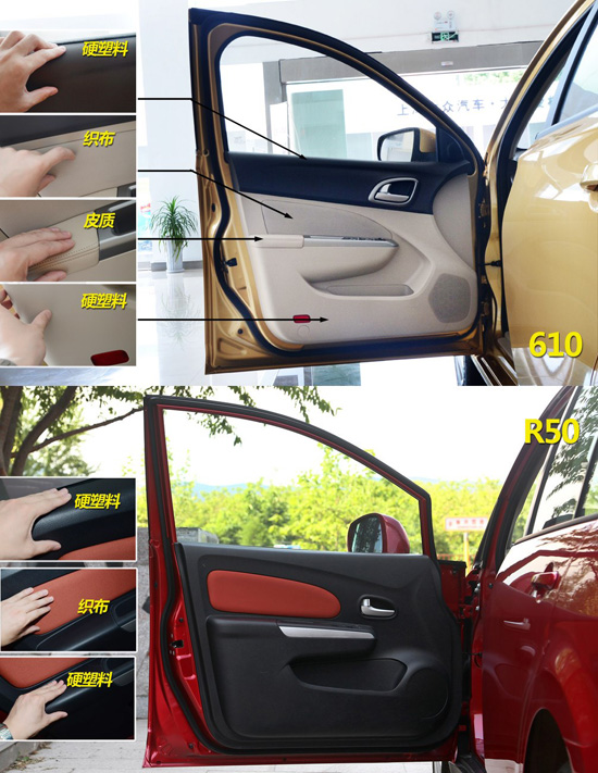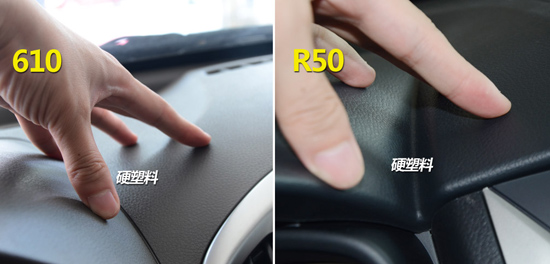 610的車門很厚重,內(nèi)部用料中規(guī)中矩,上面為硬塑料,中間為織布、內(nèi)門托為皮質(zhì)、下方為硬塑料。而R50的車門相對(duì)比較輕,內(nèi)部用料要也要遜色于610,上面、內(nèi)門托和下方均為硬塑料,中間為織布。