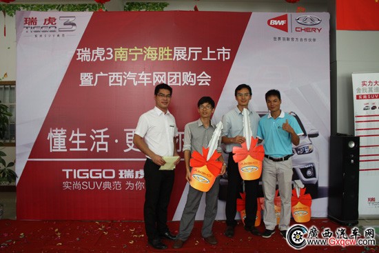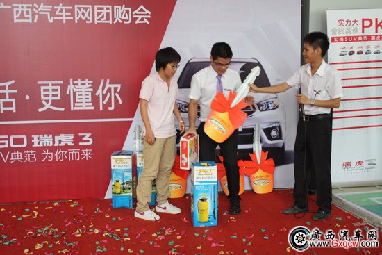 在主持人開場白,領(lǐng)導(dǎo)致辭等一些常規(guī)活動(dòng)環(huán)節(jié)后,團(tuán)購政策出來了,現(xiàn)場網(wǎng)友一片歡呼,各車型小組一番討論后,陸續(xù)報(bào)名下單,下午17:10分,訂車數(shù)達(dá)22臺(tái),成交率為78.57%,網(wǎng)友選擇的多為瑞虎3和瑞虎5以及艾瑞澤車型,當(dāng)天優(yōu)惠除了現(xiàn)場超低的團(tuán)購價(jià)外,還享受了網(wǎng)上報(bào)名額外優(yōu)惠500元,前10名訂車網(wǎng)友還獲得了汽車網(wǎng)送出的車載洗車器一臺(tái),海勝奇瑞店老總臨時(shí)特批百元禮品一份,本次團(tuán)購對(duì)網(wǎng)友來說真是碩果累累,獲利頗多啊。