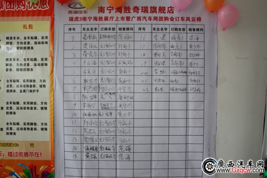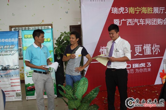 6月21日,廣西汽車網(wǎng)奇瑞汽車冰點(diǎn)團(tuán)購會(huì)在南寧海勝奇瑞汽車4S店隆重舉辦,在短短三周的宣傳期,網(wǎng)上報(bào)名人數(shù)達(dá)到了78人,經(jīng)過汽車網(wǎng)客服確認(rèn)下,活動(dòng)當(dāng)天到店人數(shù)只有28批,確實(shí),這跟網(wǎng)上報(bào)名人數(shù)有點(diǎn)落差,當(dāng)天到場訂車有22人。