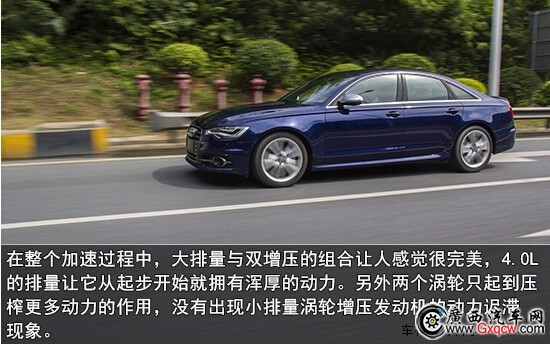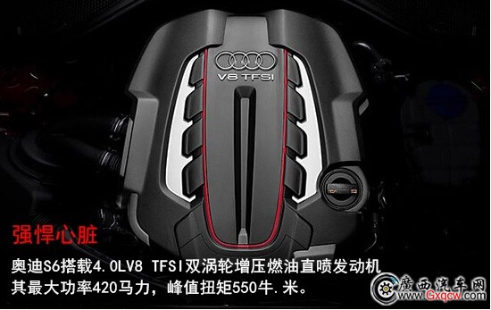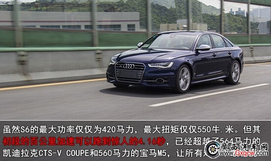 我們很有必要了解下這臺(tái)S6的動(dòng)力總成, 4.0L V8 TFSI雙渦輪增壓燃油直噴發(fā)動(dòng)機(jī)匹配7速S-tronic雙離合變速箱,在5500-6400 rpm/min時(shí)能輸出309KW(420馬力)最大功率,并且在1400-5200 rpm/min 的轉(zhuǎn)速區(qū)間內(nèi)都可以持續(xù)輸出550 n•m的峰值扭矩。官方數(shù)據(jù)百公里加速僅需4.6秒,而實(shí)際測(cè)試結(jié)果更讓人出乎意料,其百公里加速可以達(dá)到驚人的4.16秒。這樣的實(shí)力已經(jīng)超越了564馬力的凱迪拉克CTS-V COUPE和560馬力的寶馬M5,讓所有對(duì)手不敢輕視!S6具備這樣實(shí)力也跟具備彈射起步功能的七速雙離合變速箱和優(yōu)異的quattro四驅(qū)系統(tǒng)分不開(kāi)。兩者結(jié)合,使得奧迪S6能以將近5000rpm的高轉(zhuǎn)速?gòu)撵o止開(kāi)始起跑,而且輪胎全然不會(huì)出現(xiàn)任何打滑,在這一點(diǎn)讓很多大排量的高性能車(chē)都難以望其項(xiàng)背。