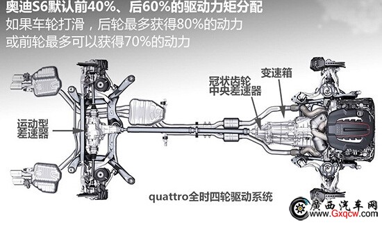 另外特別需要提一提奧迪賴以為榮的quattro四驅(qū)系統(tǒng),在默認(rèn)情況下這套系統(tǒng)采用的是前后4:6的動(dòng)力分配,而如果遇到車(chē)輪打滑后,其動(dòng)力輸出比可以在2:8和7:3這個(gè)范圍內(nèi)自動(dòng)調(diào)整。小齊發(fā)現(xiàn)這個(gè)系統(tǒng)能帶給駕駛著帶來(lái)信心和樂(lè)趣,雖說(shuō)是臺(tái)大排量的性能車(chē),但你不用過(guò)多分心于你的駕駛操作方式,因?yàn)檫@個(gè)quattro系統(tǒng)有非常好的包容性。