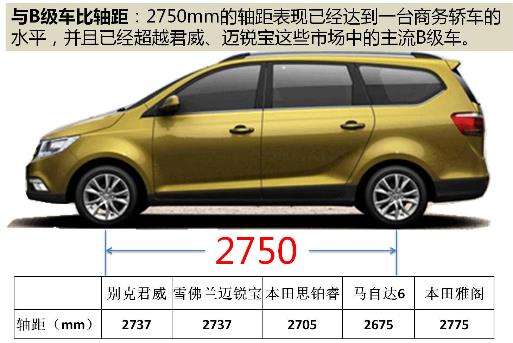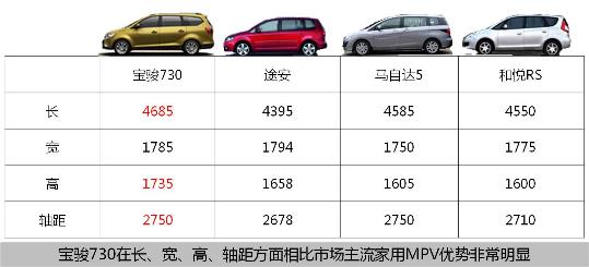 在與主流家用MPV的數(shù)據(jù)比拼中,寶駿730在車身長度、高度、軸距方面完勝對手,并且優(yōu)勢非常明顯。