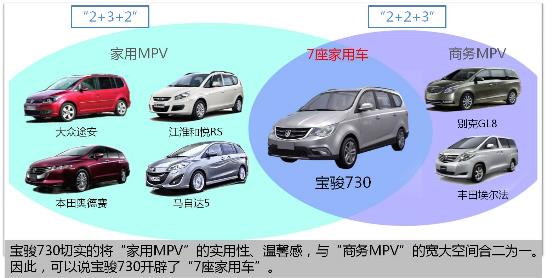 在寶駿730出現(xiàn)之前,談及家用MPV,我們自然會想到大眾途安、本田奧德賽這些基于成熟轎車平臺的衍生產(chǎn)品,同時(shí)也不能忘記豐田逸致、起亞佳樂、江淮和悅RS這些后起之秀,“2+3+2”的座椅布局使他們看起來更像是一臺兩廂轎車,而長時(shí)間處于平躺狀態(tài)的第三排座椅似乎只是為克服緊急情況的一個(gè)心理安慰。而寶駿730切實(shí)的將“家用MPV”的實(shí)用性、溫馨感,與“商務(wù)MPV”的寬大空間合二為一。因此,可以毫不夸張地說,基于上汽通用五菱千萬用戶升級需求,精心打造的寶駿730將開辟了“7座家用車市場”。