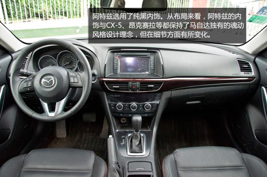 在內飾上,一汽馬自達阿特茲選用了純黑內飾。從布局來看,阿特茲的內飾與CX-5、昂克賽拉等都保持了馬自達獨有的魂動風格設計理念,但在細節(jié)方面有所變化。大家可以看到阿特茲從中央空調出風口至右側手套箱位置上,有一塊深紅色的貼片裝飾。據官網配置顯示,除了入門2.0L時尚版外的阿特茲全系都采用了這種深紅色金屬裝飾面板。其既有桃木內飾的那種尊貴感,同時也具有金屬裝飾所帶來的質感與時尚感。