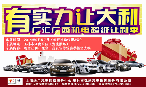 (廣西汽車網(wǎng) 訊)2014年9月5-7日在江南公園將舉辦秋季大型車展,別克全系車型鉅獻(xiàn)全場(chǎng)。車展前預(yù)定別克任何一個(gè)車型都只需1000元,不僅可享受車展底價(jià)還能在底價(jià)的基礎(chǔ)上當(dāng)2000元使用。車展3天期間,有實(shí)力讓大利的別克廣匯玉林弘通4S店還有更多大禮和驚喜活動(dòng)等您參與,還等什么?車展咨詢熱線:0775-2295666