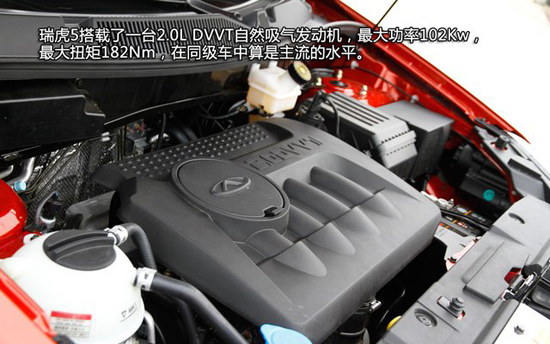 動力方面,奇瑞瑞虎5搭載一款2.0L自然吸氣發(fā)動機,并與5速手動變速器和CVT變速器相匹配。其中該發(fā)動機能提供最大102kW的動力輸出,以及182N·m的最大峰值扭矩。根據(jù)官方數(shù)據(jù)顯示,瑞虎5手動版車型的百公里綜合油耗為8.5L。