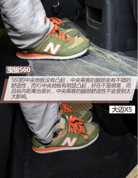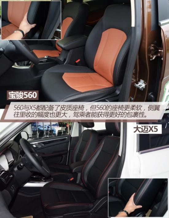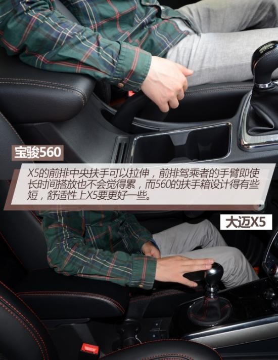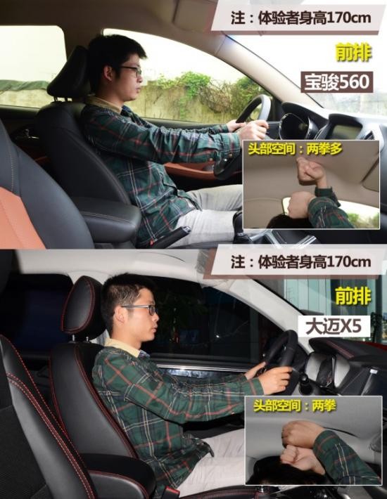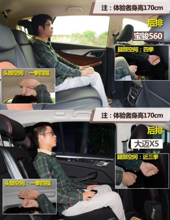 乘坐空間方面,身高170公分的體驗者,將座椅放至最低處,在大邁X5上能獲得兩拳的頭部空間,而在寶駿560上同樣能獲得兩拳多的頭部空間,前排空間,寶駿560更有優(yōu)勢。