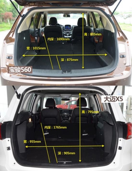 大邁X5后備箱的容積為550L,放倒后排座椅后可擴充至1200L,而寶駿560的后備箱容積為460L,放倒后排座椅后可擴充至1050L,相比X5來說,560的后備箱容積要遜色一些,但560的后排座椅放倒后,內部非常平整,X5還是有一定幅度,不是特別平,細節(jié)上560做得更好。