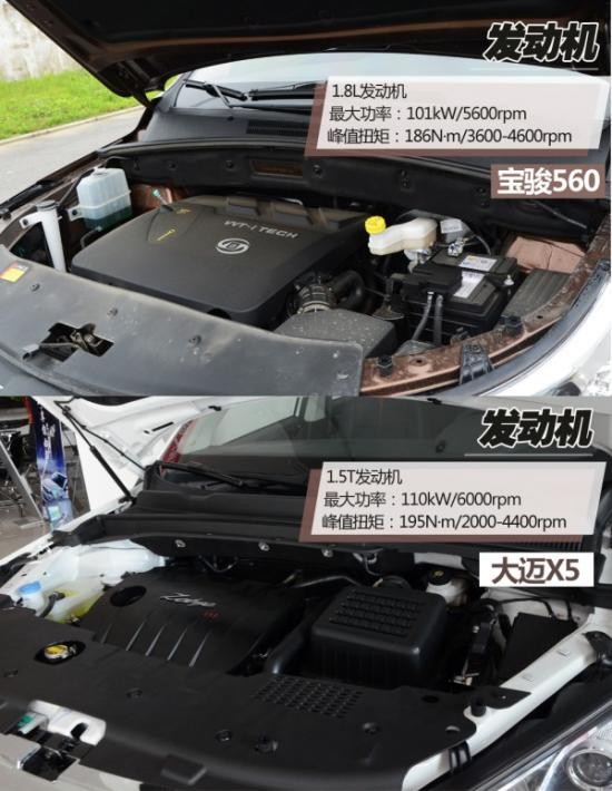 寶駿560搭載的是一臺1.8L發(fā)動機(jī),最大功率101kW/5600rpm,峰值扭矩為186N·m/3600-4600rpm,而大邁X5搭載的是1.5T發(fā)動機(jī),最大功率110kW/6000rpm,峰值扭矩195N·m/2000-4400rpm,動力上要大邁X5要優(yōu)于寶駿560。