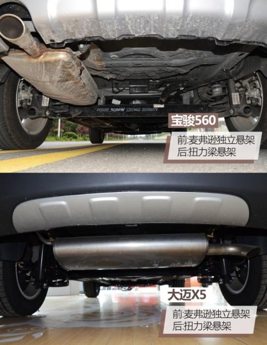 寶駿560與大邁X5的懸架都采用前麥弗遜獨(dú)立懸架+后扭力梁懸架的組合,調(diào)校風(fēng)格上,大邁X5略軟一些,而寶駿560則要硬一些,舒適性方面兩款車型半斤八兩,與同級別大部分車型采用后多連桿獨(dú)立懸架相比,寶駿560和大邁X5的懸架在檔次感和性能上都沒有什么優(yōu)勢。