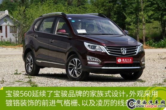 寶駿560作為上汽通用五菱旗下寶駿首款緊湊型SUV正式上市,其外觀延續(xù)寶駿家族式設計理念,寬大的盾形中網(wǎng)配合飛翼式前大燈,以及內(nèi)部三橫幅的鍍鉻處理給人感覺十分大氣。而寶駿560相比轎車更加厚重的車身看上去更有野味兒,也更符合其SUV的身份。