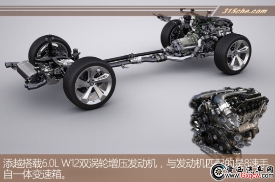 動力系統(tǒng)方面,賓利添越搭載的是一臺6.0L W12雙渦輪增壓發(fā)動機,其最大輸出功率為608馬力/6000rpm(447kW),峰值扭矩為900牛·米/1250-4500rpm。傳動系統(tǒng)方面,與發(fā)動機匹配的是8速手自一體變速箱。添越配備了帶有四種駕駛模式可選,另外還附加了四種越野模式供消費者隨時切換,其中四種駕駛模式分別為舒適、運動、自定義以及賓利標(biāo)準(zhǔn);而四種越野模式則分別為崎嶇泥沼、沙地、泥土地以及濕滑草地。