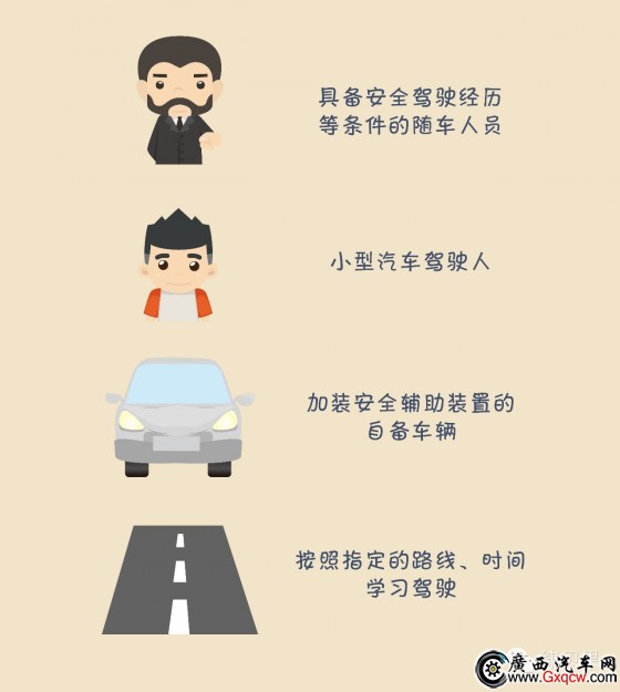 這就是說,考駕照允許個人使用加裝安全輔助裝置的自備車輛,在具備安全駕駛經(jīng)歷等條件的隨車人員指導(dǎo)下,按照指定的路線、時間學(xué)習(xí)駕駛,并直接申請考試。