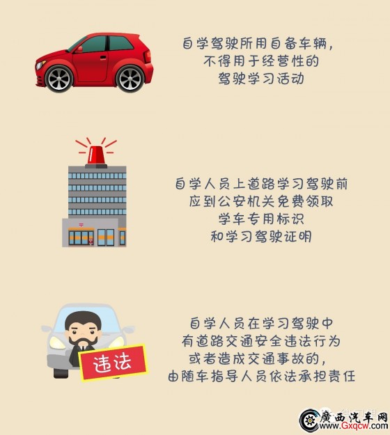 自學(xué)駕駛所用自備車輛,不得用于經(jīng)營性的駕駛學(xué)習(xí)活動。自學(xué)人員上道路學(xué)習(xí)駕駛前應(yīng)到公安機關(guān)免費領(lǐng)取學(xué)車專用標(biāo)識和學(xué)習(xí)駕駛證明。自學(xué)人員在學(xué)習(xí)駕駛中有道路交通安全違法行為或者造成交通事故的,由隨車指導(dǎo)人員依法承擔(dān)責(zé)任。