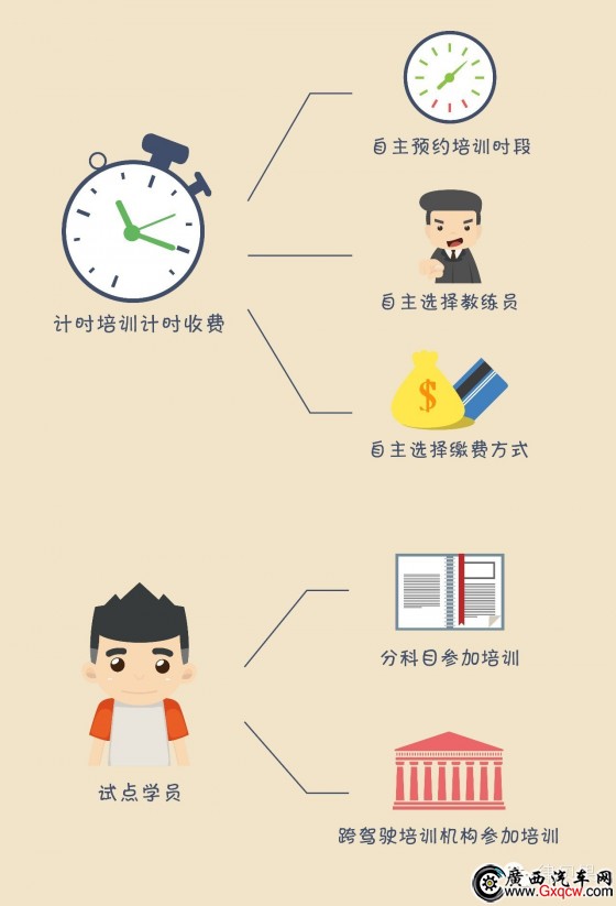 《意見》第二.(一).2條約定,.實行計時培訓(xùn)計時收費。改變駕駛培訓(xùn)機構(gòu)一次性預(yù)收全部培訓(xùn)費用的模式,推行計時培訓(xùn)計時收費、先培訓(xùn)后付費的服務(wù)措施。實行學(xué)員自主預(yù)約培訓(xùn)時段、自主選擇教練員、自主選擇繳費方式。試點學(xué)員分科目、跨駕駛培訓(xùn)機構(gòu)參加培訓(xùn)。