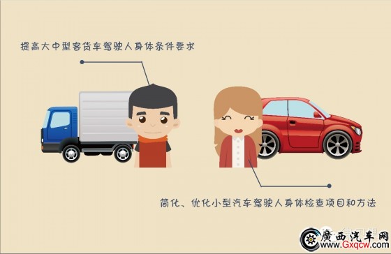 《意見》第二.(六).23規(guī)定,完善駕駛?cè)梭w檢制度。建立駕駛?cè)朔诸愺w檢制度,根據(jù)準(zhǔn)駕車型設(shè)定不同的體檢標(biāo)準(zhǔn),提高大中型客貨車駕駛?cè)松眢w條件要求,簡化、優(yōu)化小型汽車駕駛?cè)松眢w檢查項目和方法。