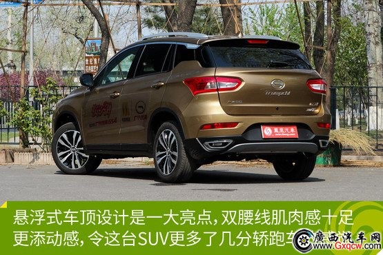 傳祺GS4這輛帥氣的SUV從外形上來說,很難找到模仿與借鑒的痕跡,這對于自主品牌的外形設(shè)計來說的確是個十分難得的事情。不僅如此,傳祺GS4的外形也并沒有因此而變得中庸,年輕、激進的感覺也都是它的關(guān)鍵詞。車側(cè)的雙腰線設(shè)計值得欣賞,肌肉感、力量感讓這臺SUV看上去更加敦實,同時也更多了幾分轎跑車的感覺。而整車最亮點的設(shè)計,莫過尾部的懸浮式車頂設(shè)計,隱藏在內(nèi)部的Trumpchi標識也有低調(diào)。