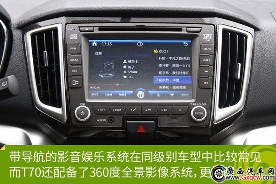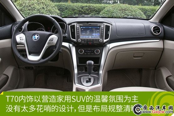 T70內(nèi)飾仍以營造家用SUV的溫馨氛圍為主,沒有太多花哨的設(shè)計,但是布局規(guī)整清晰。整體內(nèi)飾采用深淺搭配的色調(diào),分界線上用一道銀色裝飾條過渡,增添了一些時尚感。中控臺上方一塊大尺寸的觸控顯示屏,各種多媒體按鍵分布于屏幕周圍,立式的空調(diào)出風(fēng)口分列兩邊,看起來簡單大方。