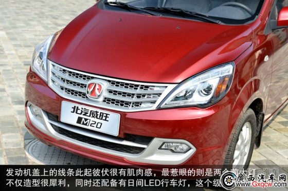 從外觀看北汽威望M20的上下進(jìn)氣格柵采用了銀灰色的面板顯得比較醒目,仔細(xì)觀看,上格柵上還有鍍鉻細(xì)條以作裝飾之用。發(fā)動(dòng)機(jī)蓋上的線條此起彼伏很有肌肉感。最惹眼的則是兩個(gè)前大燈,不僅造型很犀利,同時(shí)還配備有日間LED行車燈,這在這個(gè)級別的車型中并不多見。不規(guī)則的前霧燈除了最低配車型外,其他車型全部配備。