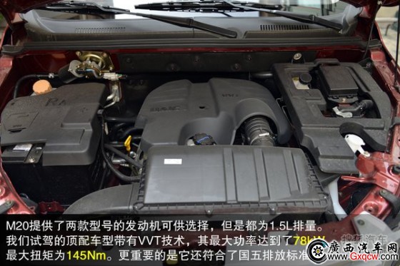 動(dòng)力方面, M20提供了兩款型號的發(fā)動(dòng)機(jī)可供選擇,但是都為1.5L排量。其區(qū)別就在于是否配有VVT技術(shù),我們試駕的頂配車型自然是帶有此技術(shù)的,其最大功率達(dá)到了78kW,最大扭矩為145Nm。更重要的是它還符合了國五排放標(biāo)準(zhǔn)。