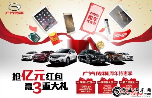一重禮:預(yù)購大紅包。凡訂購GS4、GA8、GA6、GS5 Super,有最低888元、最高4999元的現(xiàn)金紅包;訂購GA3S有最低666元,最高999元的現(xiàn)金紅包,100%中獎(jiǎng)不怕?lián)尣坏!現(xiàn)金紅包到店購車即可抵扣車款。