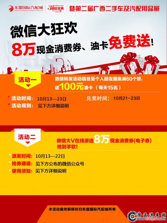 同時,關(guān)注并轉(zhuǎn)發(fā)東盟國際汽配城新車贈油卡活動至朋友圈,集滿60個贊,即可獲贈100元油卡。