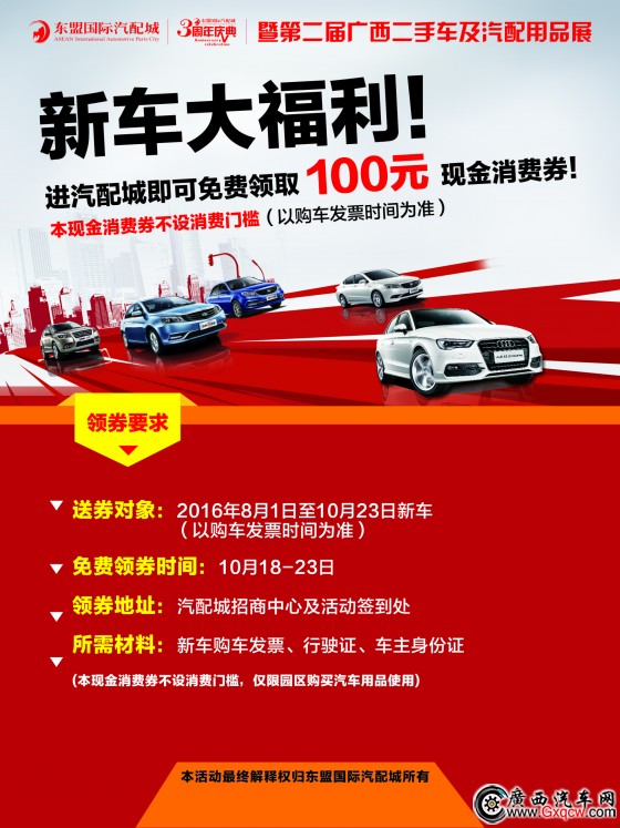 2016年8月1日-10月23日購車新車主,10月18-23日期間,憑購車發(fā)票、行駛證、身份證等有效證件在園區(qū)招商中心可免費領(lǐng)取100元現(xiàn)金消費券1張。