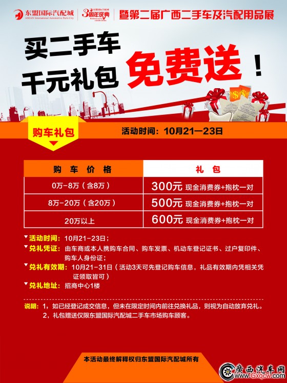 買二手車、汽配用品,優(yōu)惠多多,驚喜多多!10月21-23日,東盟國際汽配城,精彩不容錯過!