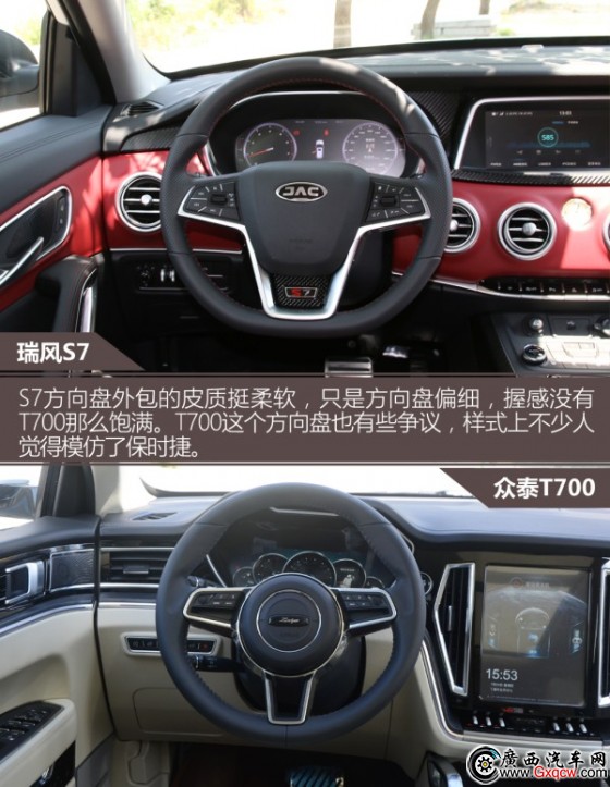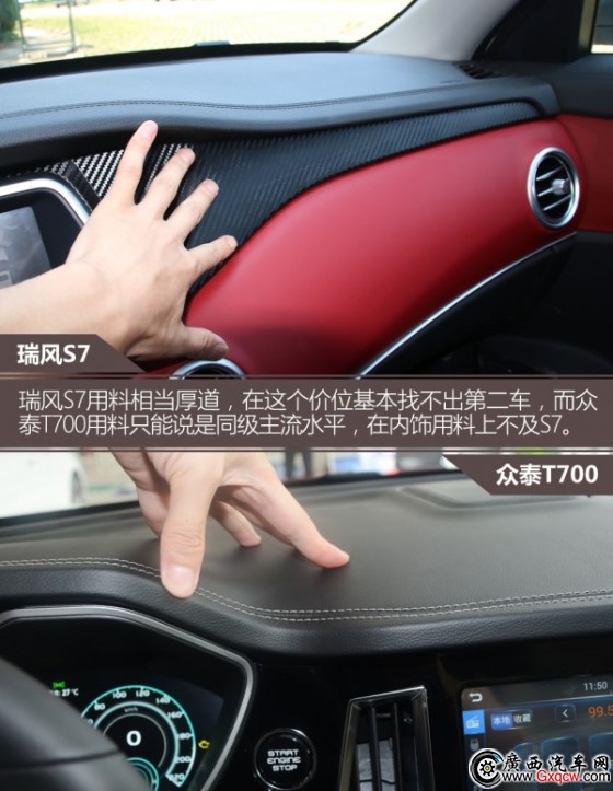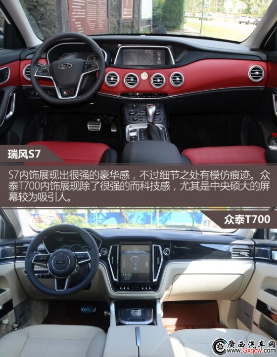 瑞風(fēng)S7內(nèi)飾展現(xiàn)出很強(qiáng)的豪華感,除了設(shè)計(jì)上的因素以外,用料也是其亮點(diǎn)。中控除了搪塑材質(zhì)以外,紅色部分都是皮質(zhì)包裹,手感相當(dāng)棒。只是遺憾的是像空調(diào)出風(fēng)口這些細(xì)節(jié)還有些模仿的痕跡。眾泰T700內(nèi)飾展現(xiàn)出了很強(qiáng)的而科技感,尤其是中央碩大的屏幕較為吸引人,中控以直線條為主,用料多以搪塑為主,因而材質(zhì)來說沒有對手那么有誠意。
